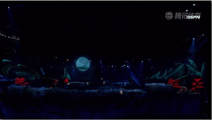 接著“瑤”攜六位蝴蝶化身的舞蹈演員從天而降,伴隨著箜篌和五弦琵琶的音色展現(xiàn)了一段充滿異域風(fēng)情的舞蹈,隨后兩只金鳳凰從舞臺兩邊同時飛出,最終碰撞于舞臺中央,將冠軍獎杯帶入現(xiàn)場。整個過程行云流水,令觀眾如癡如醉。