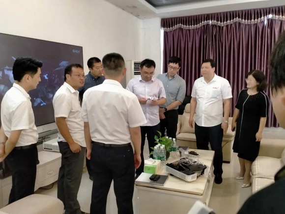 調研期間,曹區長等領導來到公司產品展廳,實地了解公司的發展狀況、產品規劃等內容,了解了公司科技創新水平及成果轉化成績,胡總、徐總全程陪同。曹區長對轟天炮在技術創新方面所取得的成績和榮譽表示贊賞,對企業獲得的“江蘇省智能投影儀工程技術研究中心”表示祝賀和鼓勵,對公司的科技創新成果給予了高度肯定。