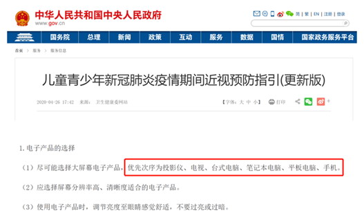 為預(yù)防近視,權(quán)威部門發(fā)布了《兒童青少年新冠肺炎疫情期間近視預(yù)防指引(更新版)》,指出在電子產(chǎn)品選擇方面,要盡可能選擇大屏幕電子產(chǎn)品,優(yōu)先次序依次為投影機、電視、臺式電腦、筆記本電腦、平板電腦、手機。