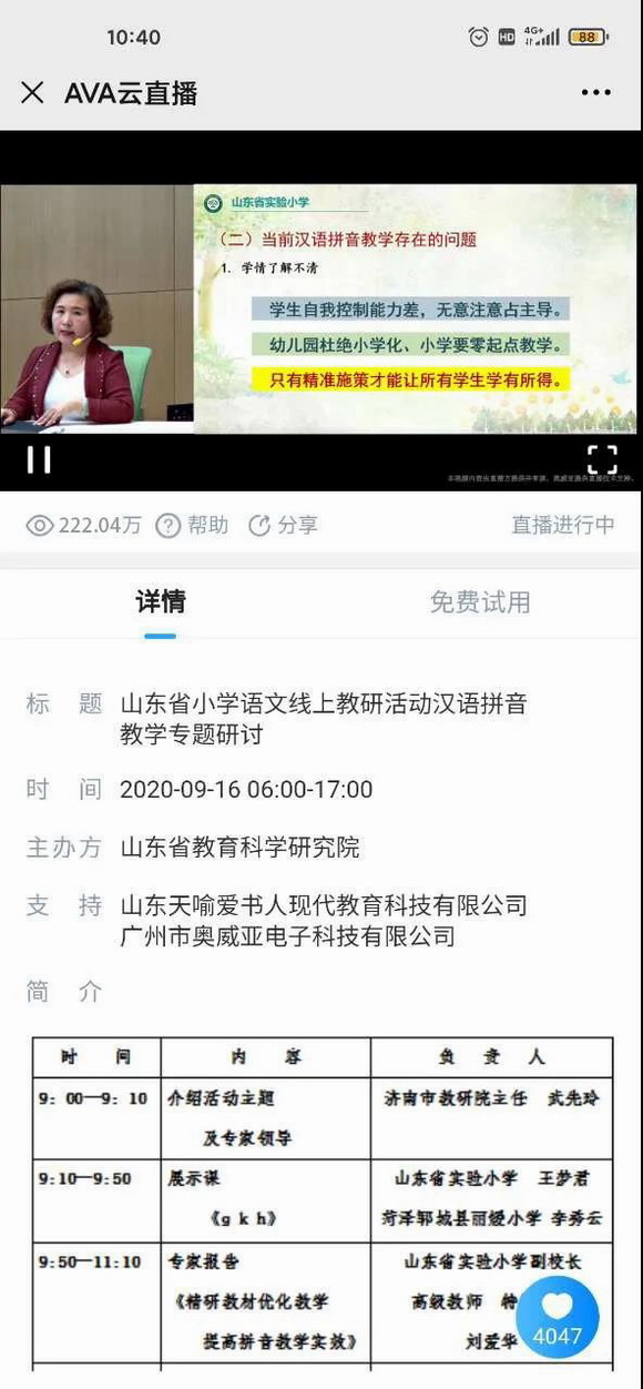 9月16日,“山東省小學語文漢語拼音教學專題研討線上教研活動”在山東省實驗小學、菏澤鄆城縣張營鎮麗媛小學舉行。來自全省數十萬名小學語文教師共聚云端,通過線上直播互動,共同探討拼音教學策略,觀看人次高達220余萬。