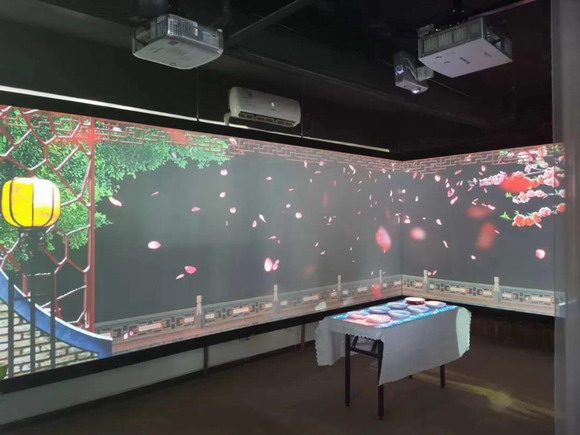 沉浸式餐廳整合投影解決方案是由折疊屏融合投影(2臺松下液晶激光PT-BMZ50C+1臺松下高端旗艦PT-BX630C)、桌面投影(1臺松下高端旗艦PT-BX440C)、紗幕全息投影(2臺松下液晶激光PT-BMZ50C)三部分組成,營造沉浸式用餐體驗。紗幕全息投影使虛擬人像活靈活現,增強了用餐環境的互動性,創意十足。