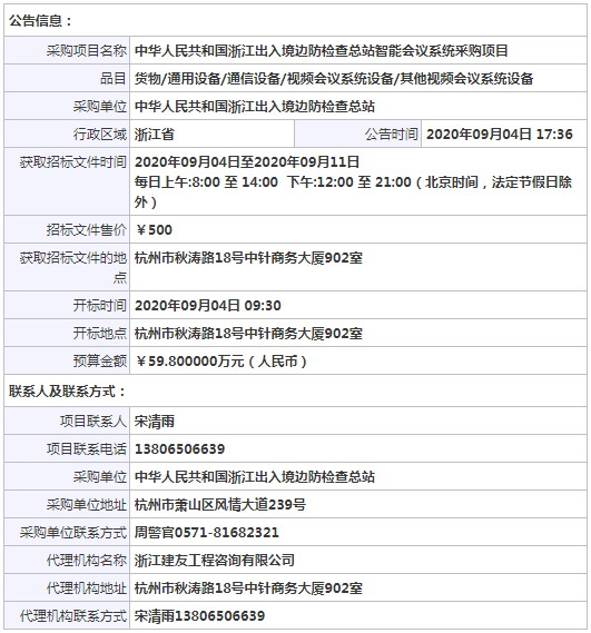 中華人民共和國浙江出入境邊防檢查總站智能會議系統采購項目公開招標公告