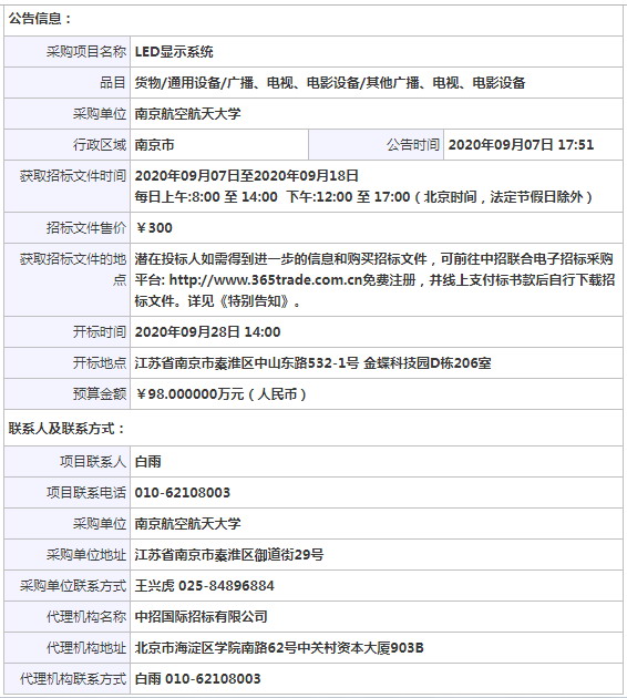 采購項目名稱: 南京航空航天大學LED顯示系統公開招標公告