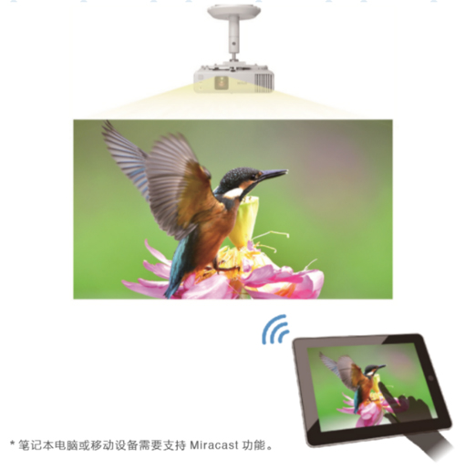 除此之外,CB-L250F還支持Miracast 功能,可以將移動設備或筆記本電腦中的內容直接鏡像至投影屏幕,無需任何連接線便可實現高清信號的傳輸。即使投影機安裝在高處,也無需“登高爬低”,隨手既能打造“新”店面,真正做到店鋪“裝修”隨心動。