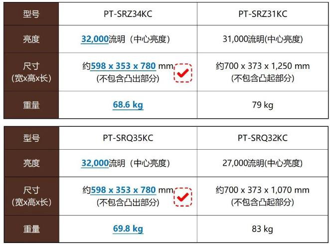 松下PT-SRQ35KC系列工程投影機是松下同類產品中更緊湊、更輕便的三芯片DLP 4K投影機,僅需兩人即可搬運和安裝,節省勞動成本。下面是PT-SRQ35KC系列與同類機型的對比,可以看到差異還是非常明顯的。