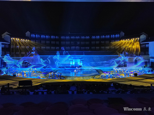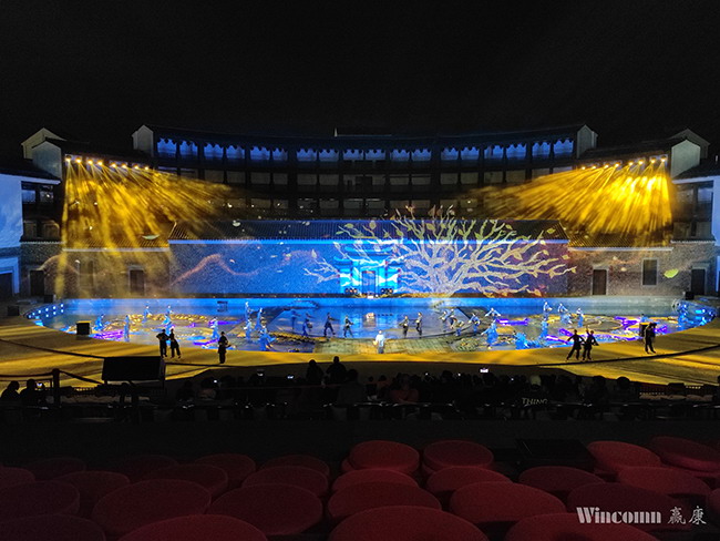 LED屏舞臺打開后,觀眾席被推出圍樓演出區域,這是該劇的最后一幕——水舞臺,贏康科技為水舞臺表演區域長70多米,高約8米的圍墻進行了投影,數十名穿著民族特色服裝的演員在升降舞臺,燈光,流水,以及投影的共同作用下,將一場謝幕表演變成了一幅具有民族特色的感人畫卷。