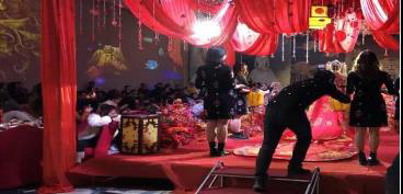 濱江酒店的這場漢唐式婚禮,是在元旦期間舉行的。漢唐式婚禮是中式婚禮的代表,是漢唐傳統文化精粹之一,除了大紅花轎,壯觀的儀仗隊,拜天地,掀蓋頭,身穿鳳冠霞帔,狀元服等,還有各種傳統的道具、純手工縫制的刺繡行頭、 窗戶上的貼花........,這些都是非物質文化遺產,而且很多都已經失傳,婚慶現場也不可能一一還原,這時光影技術的應用就顯得尤為重要了。