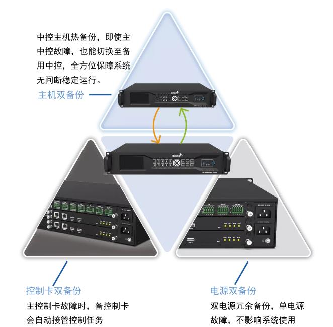 作為各類子系統控制的核心,朱雀中控具備綜合冗余備份機制,包括雙控制卡熱備、雙機熱備、雙電源冗余備份等,為設備安全與穩定性提供充足的后備保障。