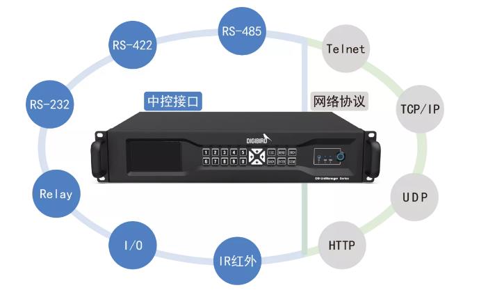朱雀中控主機在接口方面支持 RS-232,RS422,RS485,I/O,IR,Relay 等多種接口, 網絡協議方面支持 HTTP,UDP,TCP/IP,Telnet 等多種協議,兼容市面上的主流 常見設備的對接,對接能力強大、便利、高效、可靠。
