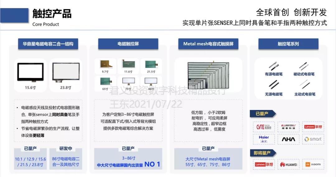 深圳市華鼎星科技有限公司成立于2012年,目前在東莞大嶺山、及江西萬安縣均設有生產基地,廠房總面積15000平,公司在國內外獲得多項發明專利技術,具備強大研發實力和市場前景,有著上下游整合開發能力,從自我研發晶片、電路開發、模組設計、制造加工、可靠性驗證,發展以電磁式觸控屏/Metal mesh電容式觸摸屏/電磁電容二合一觸控屏及觸控筆產品為核心的新型高科技型企業,可為客戶提供觸控產品全方位完整的解決方案。