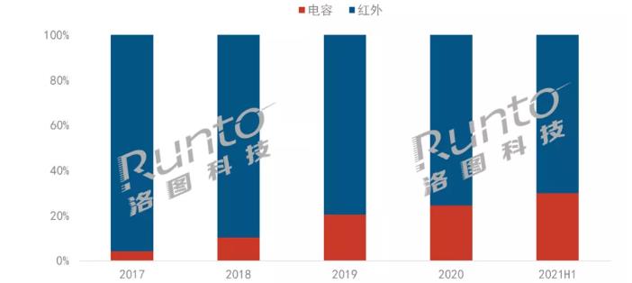 在觸控技術方面,根據洛圖科技(RUNTO)數據顯示,近5年,隨著校園課件軟件的開發和推廣,配合電容觸控產品技術的不斷成熟,產品結構逐漸向電容轉移,電容技術在液晶交互平板的占比從2017年的4%提升到了今年上半年的26%。