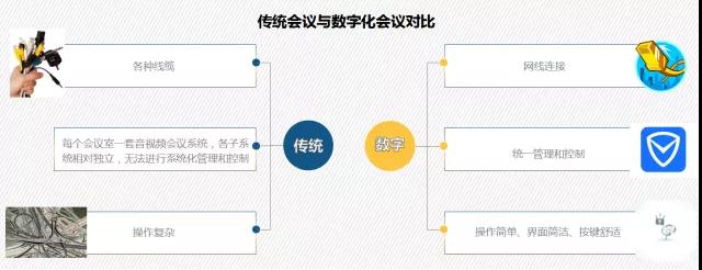 而數字化會議采用以數字網絡、智能控制技術為基礎,所有設備通過網絡連接的方式,實現系統(tǒng)各個實體功能的硬件設備可以部署在局域網絡連通的任何地點,針對傳統(tǒng)音視頻的各項不足做出了巨大提升,已成為當今音視頻系統(tǒng)發(fā)展的方向,使用網絡傳輸的一體化數字處理系統(tǒng)正逐步取代傳統(tǒng)一大堆分立的模擬設備。