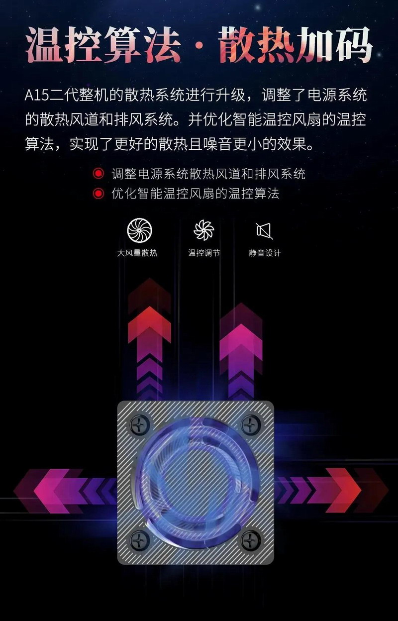 與此同時,A15二代對整機的散熱系統進行了升級,調整了電源系統的散熱風道和排風系統。并優化智能溫控風扇的溫控算法,實現了更好的散熱且噪音更小的效果。