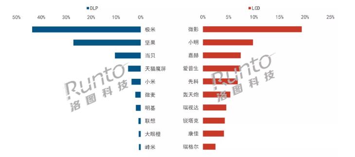LCD技術的產品陣營總份額約為32%。TOP3品牌依次為微影、小明、嘉赫,三者合計份額達到36.6%,較上月反而下降1.8個百分點。LCD市場的品牌變動依舊頻繁,不存在主要規律。與上月相比,TOP10有8個品牌排名發生變動,其中,先科、銳塔克擠入前十。微影穩居第一,銷量同環比均增長,同比漲幅近一倍;小明直升至第二名,銷量環比增長超300%;愛普生促銷力度大,排名升至第四位,銷量同比增長超200%,環比增長接近150%。