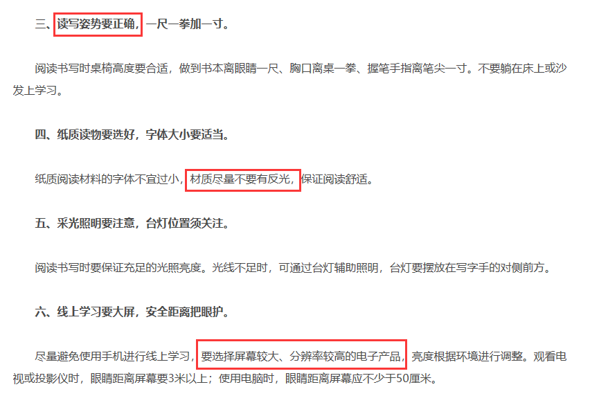 眾所周知,中小學階段正處于視力發(fā)育的關鍵時期,呵護用眼健康,不僅要保持正確的讀寫姿勢,還要主動選擇有益于眼健康的環(huán)境。對此,《要訣》中明確提出了“讀寫姿勢正確”、“閱讀材質不反光”、“選擇屏幕較大、分辨率較高的電子產品”等需求。