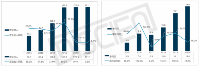 視源-2015-2020年營業收入(左圖)凈利潤(右圖)