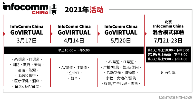 北京InfoComm China 2021除了7月21-23日在北京的國家會議中心舉行線下展會,更將分別于3月17日、4月14日和5月20日舉辦三場InfoComm China GoVIRTUAL活動。