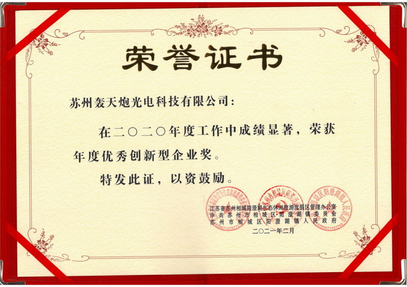 熱烈慶祝蘇州轟天炮光電科技有限公司榮獲《2020年度蘇州優秀創新型企業》的先進稱號