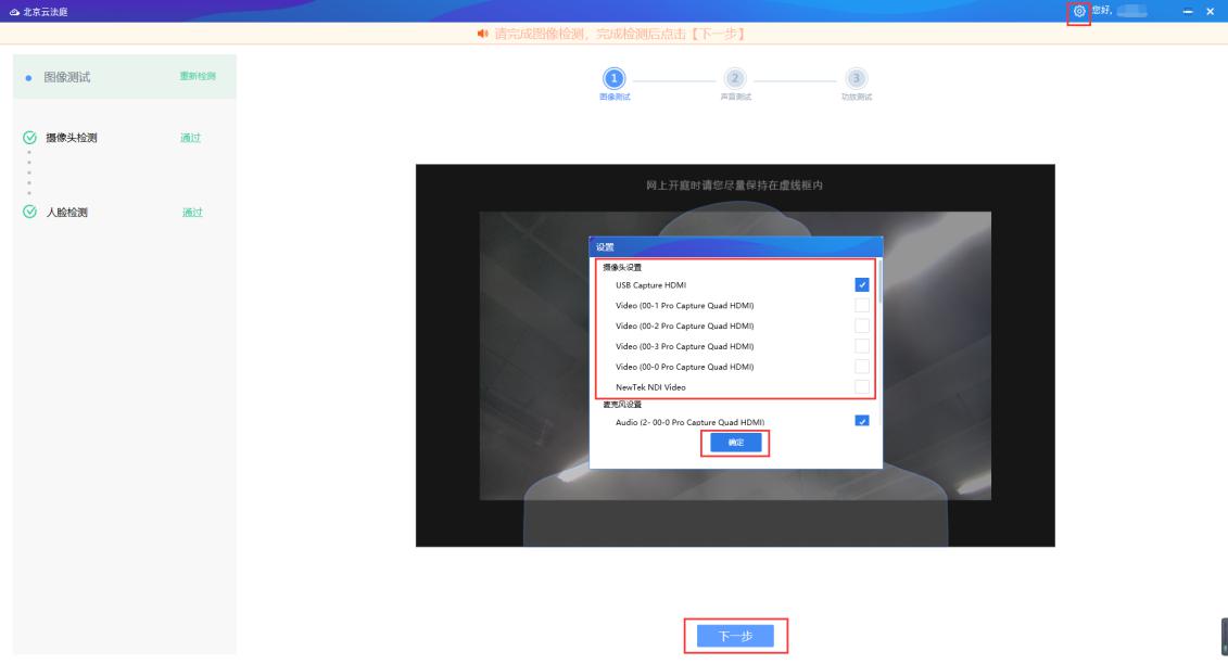 4、登錄“北京云法庭”軟件,點擊右上角“設置”,在彈出設置-攝像頭設置列表中可以看到美樂威USB Capture HDMI視頻采集棒和Pro Capture Quad HDMI四路視頻采集卡。“北京云法庭”軟件可以自動識別美樂威視頻采集設備并實現視頻采集。在此環節中,用戶可以完成圖像檢測、攝像頭檢測和人臉檢測。