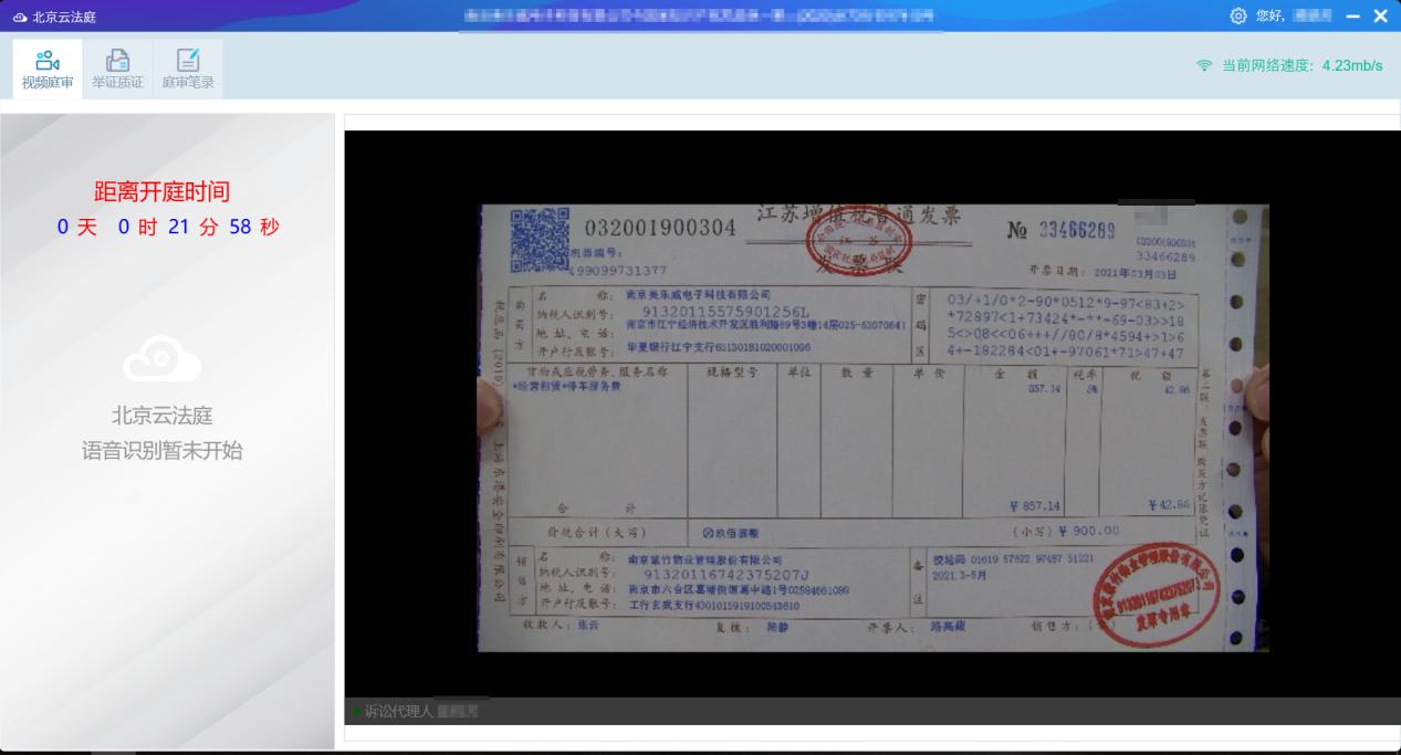 7、線上開庭效果對比展示。如下是“北京云法庭”舉證效果展示,以發票單據舉證為例: