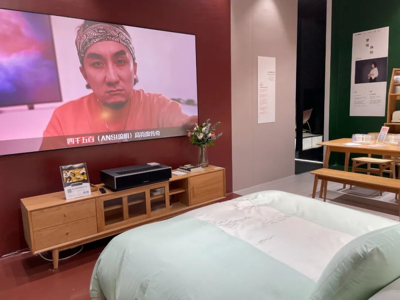 除了提供好玩的大屏,峰米科技也非常關心年輕人的睡眠以及精神世界。本次展會,峰米科技聯合南方寢飾,打造了一個愜意的臥室空間樣板間,特別為臥室空間搭配了峰米激光電視4K Max大屏,超短焦設計不占空間,100英寸超大屏幕壁掛,可作顯示屏亦可作壁畫裝飾(峰米還可設計柔性可卷屏幕隱藏式安裝),在活潑靜謐的環境下,能夠讓勞累了一天的身心得到放松,如果有興致還可以睡前看一場大電影,讓身體和靈魂都在滌蕩中修行。把臥室改造成電影院,一人是獨自享受,二人就是浪漫滿屋!