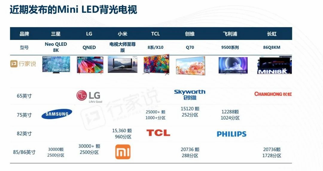 而從Mini LED背光應用領域看,去年開始,Mini LED資本熱度大增,全年新品密集發布,以芯片消耗拉動最大的電視場景為例,三星、LG、小米、TCL、創維、飛利浦、長虹、夏普八大電視品牌廠為例,均陸續高調推出了號稱Mini LED版電視。