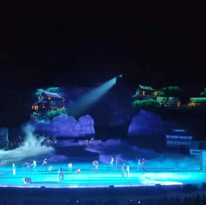 不同于其他投影,實景演繹秀承載影像的不是實體面,而是投在破碎感的樹葉和山體這種不平整、復雜的投影面上。這直接導致了成像困難,且成像光損耗嚴重。