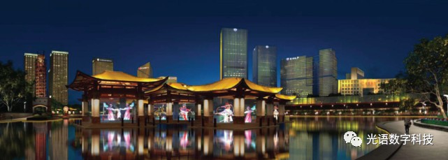 該項目充分利用了周邊的環湖建筑、涼亭、水景等空間載體,通過13棟建筑樓宇,湖面上一塊升降式3D全息屏,近300米跨度的自動起降裝置搭建的透明格柵屏和透明網投影系統裝置,建構近、中、遠,高、中、低圍合式舞臺立體空間關系。