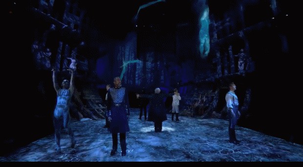 老戲骨西蒙·拉塞爾·比爾與精靈 Ariel同臺飚戲。普洛斯帕羅運用書、法衣、魔杖,指揮精靈,讓觀眾感嘆數字化演員和真實演員一樣精彩。