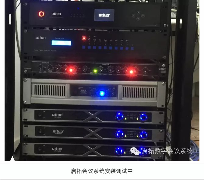此次啟拓(QITUO)參與的項目為天津電氣科學研究院報告廳項目。啟拓(QITUO)為該音頻會議項目提供多套設備,包括會議系統和音箱擴聲系統。項目主要使用啟拓數字會議主機QT-S520M一臺、啟拓會議系統單元機QT-S522七只(其中主席機一只)、啟拓中央集成控制主機QT-ZK60WF一臺、啟拓時序電源控制器DY802 一臺、啟拓18寸低頻音箱QT-H18 兩臺、啟拓15寸全頻音箱QT-H15 兩臺、啟拓18寸低頻音箱功放QT-MS550 一臺、啟拓15寸全頻音箱功放QT-MS550 一臺、啟拓單12寸返聽音箱功放QT-MS350 一臺及其他設備若干。