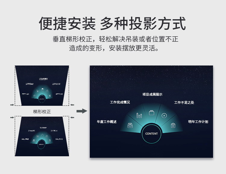 在顯示畫質得到提升的同時,CR3100H系列新品投影機擁有僅為2.6kg的羽量級重量,體積小巧便于安裝。而前排風設計也巧妙地避免了對側部、后部排風空間的占用,提升空間利用率的同時也有效提升了整機的散熱效率。該系列還具備垂直梯形校正±40°,功能實用性強,畫面校正能力優秀,能夠在固定安裝時加強圖像調整的靈活性。