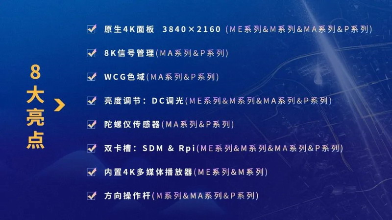 四大新品系列不僅保留了經典的溫度傳感器、顏色傳感器、亮度傳感器,可以對顯示器的狀態進行智能跟蹤管理,實現機器內部溫度的智能調節、顏色的精準調節,為客戶帶來便捷與更加安全的使用,讓機器運行更加安全穩定;陀螺儀傳感器還被創新性地應用在新品MA、P系列旗艦顯示器上,提供了多種智能提醒功能,如當顯示器受到外部撞擊時會主動提醒、當顯示器安裝方向錯誤時智能提醒,顯示畫面以及顯示器菜單能跟隨顯示器安裝角度自適應旋轉等功能,產品使用更加便捷智能。