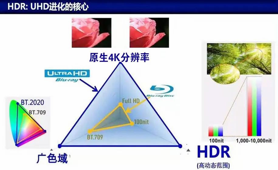 因為,4K藍光標準對比2K藍光標準的主要提升是:原生4K分辨率、DCI-P3廣色域、高動態范圍HDR。