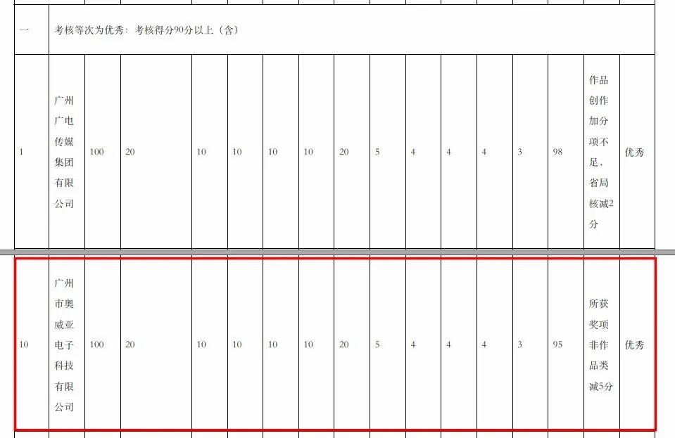 近日,廣東省廣播電視局發布了“關于廣東省2020年度國有廣播電視節目制作經營企業社會效益評價考核結果的公示”,奧威亞獲得考核最高等次“優秀”,綜合評分為95分。