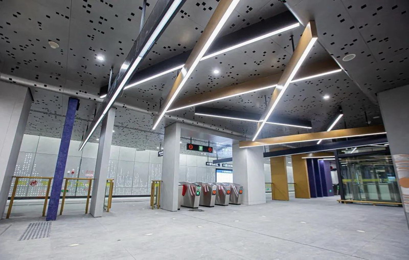 銀湖站吊頂裝飾以“銀湖之光”為設計主題,中心區域以宇宙空間為主導地位,運用現代設計的手法,弧形面板燈組成圓環,中間加入條形面板燈與鋁板結合形成藝術星空效果,以中心為原點進行微妙的旋轉,用燈光代替日月星辰,訴說來自宇宙的神秘和浪漫,讓乘客置身于浩瀚無垠的太空宇宙中。