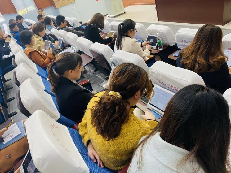 此次會(huì)議邀請(qǐng)了希沃總部智慧課堂教研顧問紀(jì)思童做教研培訓(xùn)。學(xué)校小學(xué)部、初中部、高中部全體智慧課堂班學(xué)科教師參加本次培訓(xùn)。通過上午的課程觀摩,教研團(tuán)隊(duì)已充分了解到教師日常教學(xué)中智慧課堂的運(yùn)用情況,因此,在培訓(xùn)前特別向老師們介紹了以課前、課中、課后三個(gè)版塊組成基于智慧課堂的基本教學(xué)模式。