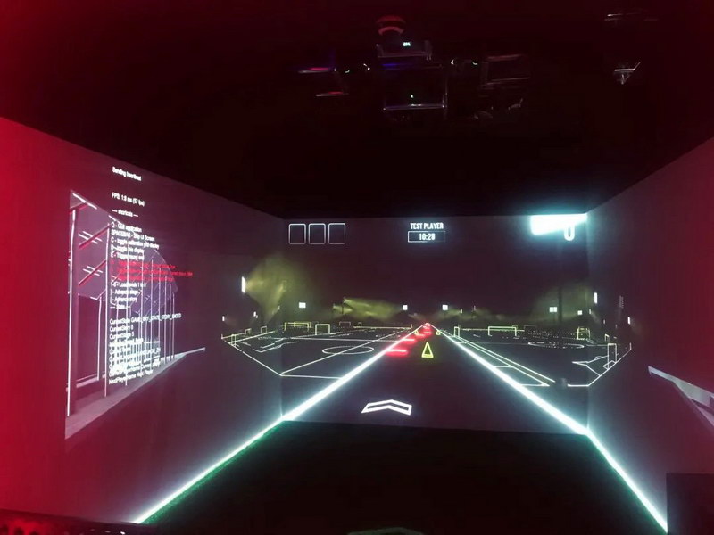 特別是“曼聯(lián)體驗”的CAVE沉浸式空間,是非常獨特的創(chuàng)新應用。常見的CAVE都是背投,占地面積大,而夢劇場沉浸式體驗區(qū)中的CAVE選擇了正投設計,最大化利用了寸土寸金的可應用空間。該方案的光路設計非常有挑戰(zhàn),贏康憑借自己的專業(yè)經(jīng)驗為其量身定制了完美的解決方案。