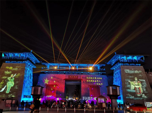 此次燈光秀便是在這曹魏古城南城門下伴著暮色上演,充分利用聲、光、電手段講述三國文化,生動刻畫了這座古城的三國歷史起源,人文典故和文化符號,在追求整體視覺效果的同時,重點突出了古城的人文底蘊和文化內涵,一陣陣狼煙四起,一幅幅沙場征戰,吸引了現場眾多觀眾的目光。