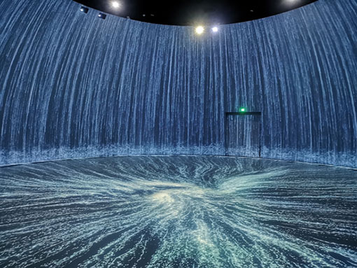 “飛流直下三千尺,疑是銀河落九天”,大詩人李白描述的壯美奇景在這里“真實”再現。宛如蛋殼的球幕展廳里,巨型瀑布傾瀉而下,似銀河從天而降,并在地面迅速匯聚成河,波光粼粼、浩瀚無垠,令觀者贊嘆不已。得以呈現如此雄偉壯觀的瀑布奇景,離不開20臺NEC 4K激光投影機PX1005QL-B+的精彩演繹。巨型碗幕直徑15.4米,高度5.9米,20臺NEC PX1005QL-B+通過隱藏式安裝,采用融合拼接的方式,分別在近百平方米的弧形墻面和圓形地面上進行投射,打造沉浸式互動投影,將觀眾帶到“廣闊無邊”的水世界中,感受瀑布飛流直下的壯麗美景。