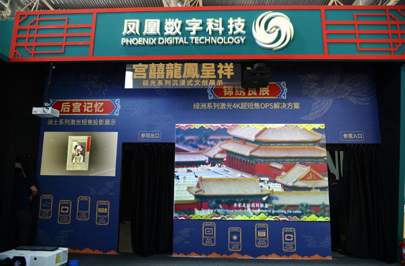 文創IP“宮囍龍鳳呈祥”,由北京故宮文化傳播有限公司、北京鳳凰數字科技有限公司、清控創意智造(北京)文化產業發展有限公司聯合打造,其數字內容以清代宮廷畫作《載湉大婚典禮全圖冊》為參考,通過三維渲染真實還原光緒皇帝大婚時的流程、情景、道具、人物。展會現場,NEC激光投影機穿越時空,助力“宮囍龍鳳呈祥”數字影像精彩展示,讓觀者沉浸式感受紫禁城大婚禮儀中的吉祥喜慶和詩賦中“八景鳳輿臨紫禁”的大氣磅礴。