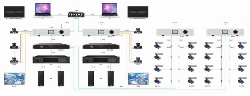 系統示意圖中,每一條線路的會議單元分別接到兩個主機上面,主機之間采用較短的T型線連接。