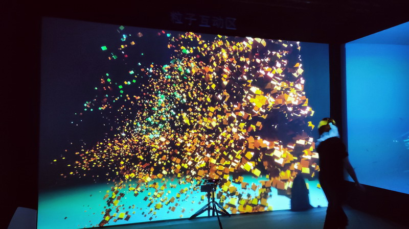 進入展臺主展示區,其余三組展示方案同樣精彩紛呈。結合激光雷達裝置,體感粒子互動展示區使用一臺Vivitek(麗訊)激光工程投影機打造而成,靜止時,畫面是一面大型背景墻,當有人經過,背景則動態反饋粒子擴散效果,同時捕捉動作實時動態展示。