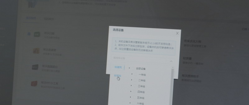 因為學生放學而略顯沉靜的教學樓長廊上,信息中心韓老師關好教室門后,低頭認真地看著手機。放學后原本是韓老師巡查教室,檢查一體機關閉情況的時間,此時他卻通過希沃集控輕松掌握全校65間教室一體機的運行情況。利用希沃集控遠程關機功能,韓老師點一下手機便能輕松關閉遠處教學樓的一體機。