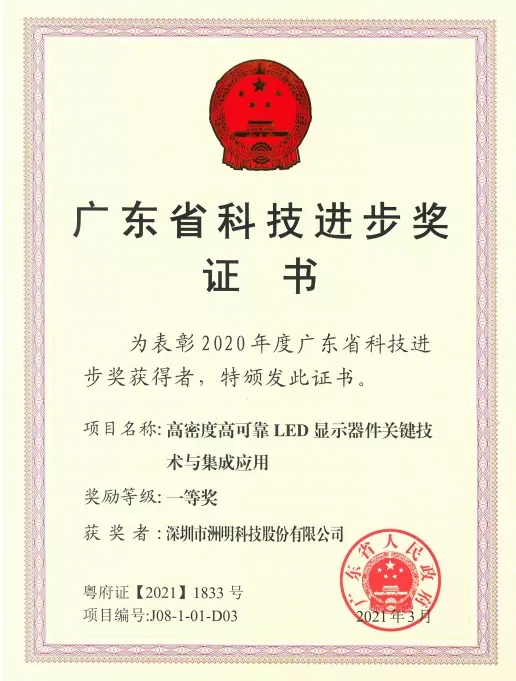 近日,2020年度廣東省科學技術獎發(fā)布,深圳市洲明科技股份有限公司與國星光電等單位聯(lián)合申報的“高密度高可靠LED顯示器件關鍵技術與集成應用”項目榮獲廣東省科技進步獎一等獎,繼國家科技進步一等獎之后,技術創(chuàng)新再獲權(quán)威認可。