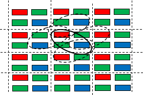 硬件上,根據空間混色理論人眼的視覺特性,增加一顆綠光芯片,再采用亞像素排布技術、亞像素復用顯示技術、亞像素采樣顯示技術,將傳統LED芯片硬件排列變為RGBG排列,將原來RGB排布的像素間距縮小一半。通過上下左右亞像素復用,產生了虛線橢圓中的四個虛擬像素。