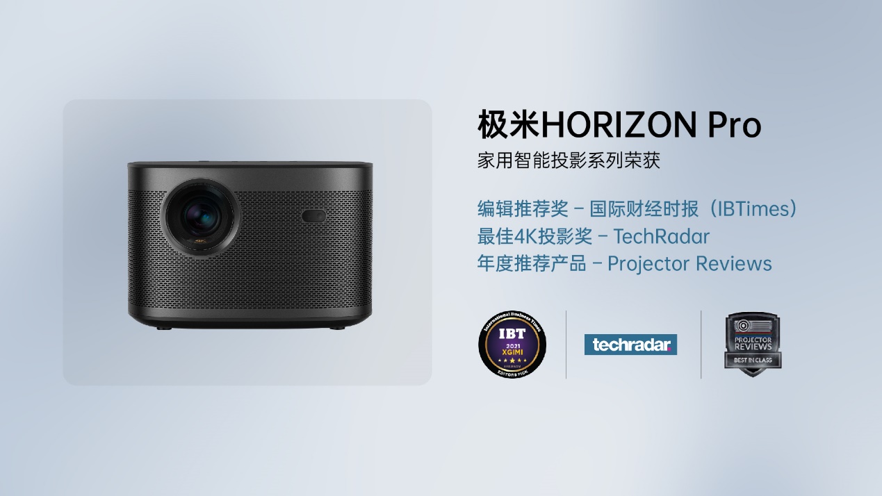 繼Halo與MoGo Pro兩款便攜智能投影在海外市場大獲成功后,今年5月,極米科技(股票代碼:688696.SH,簡稱“極米”)宣布正式推出全新的HORIZON系列家用智能投影,旨在通過更豐富和更完善的產品組合進一步拓展并加速極米在海外市場的布局。憑借優秀的畫質表現、易于使用的智能操作以及超凡的創新設計理念,極米HORIZON系列一經推出便迅速引發海外多家權威媒體的關注與報道,同時榮獲了《國際財經時報》(IBTimes)“編輯推薦獎”以及TechRadar“最佳4K投影獎”等多項殊榮。此外,投影行業知名媒體Projector Reviews還將極米HORIZON Pro 4K家用智能投影評選為年度推薦產品。