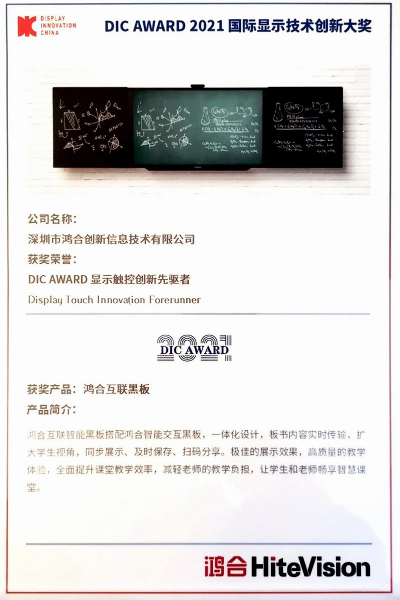 DIC AWARD | 鴻合互聯(lián)智能黑板獲頒國(guó)際顯示技術(shù)創(chuàng)新大獎(jiǎng)