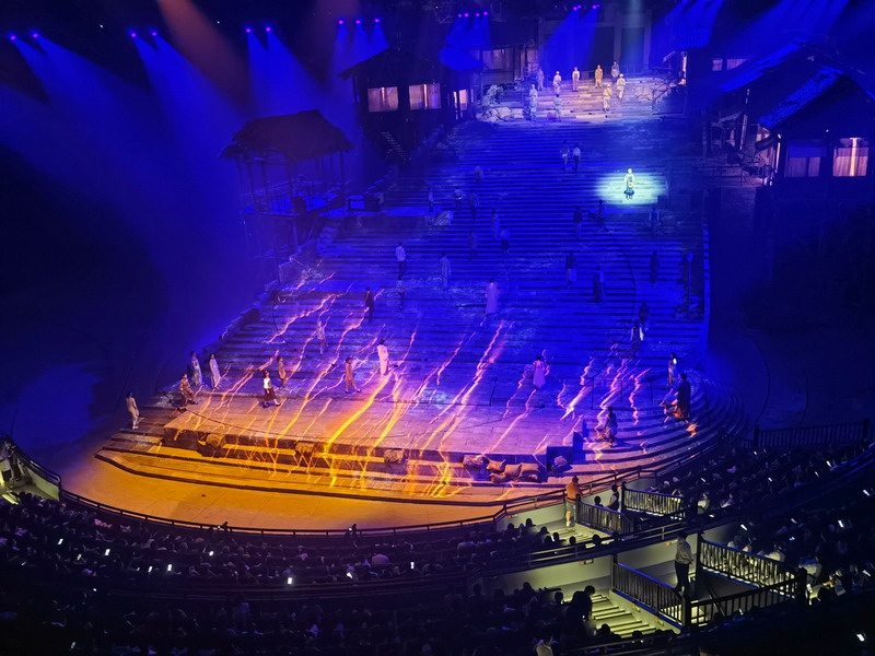 “重慶·1949大劇院”是為《重慶·1949》劇目量身定制的大型非標實景式劇院,總建筑面積達2.5萬平方米,是目前世界上最大的單一室內(nèi)動態(tài)沉浸式表演劇場。其顛覆性創(chuàng)新,向觀眾呈現(xiàn)了前所未見的多維立體沉浸式室內(nèi)動態(tài)舞臺。整個舞臺由5個可360度旋轉(zhuǎn)的圓環(huán)組成,其中1、2、3環(huán)為核心表演及布景區(qū)域,4、5環(huán)既是舞臺也是觀眾席,演藝空間與觀演空間交相穿插,隨著劇情的發(fā)展而不斷變換視角位置,使觀眾與演出完全融為一體,從而營造出身臨其境、如夢如幻的獨特觀演場景體驗。