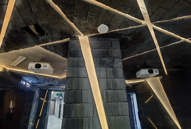 在觀眾入口處,6臺NEC高端激光工程液晶投影機PA703UL+(7000流明、WUXGA分辨率)分別通過霧幕投影和地面投影的方式對實景劇海報內(nèi)容予以創(chuàng)意展現(xiàn),吸引觀眾眼球。其中4臺PA703UL+通過兩兩融合的方式,創(chuàng)新性地打造了兩塊霧屏,帶給觀眾亦真亦幻的立體視覺享受。當觀眾穿越霧屏進場時,仿佛跨越時空,穿越回了那座黎明前的“山城”,去領(lǐng)略那段滿含悲壯而又令人肅然起敬的歷史。PA703UL+擁有REC.2020廣色域,令霧屏的色彩表現(xiàn)絢麗多彩;2500000:1的超高對比度,使得畫面層次感更強烈,視覺感受更具沖擊力和立體感。