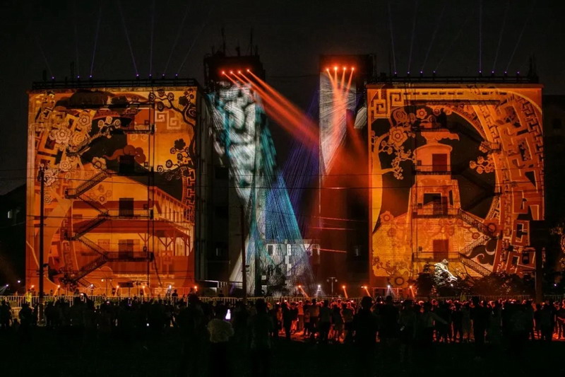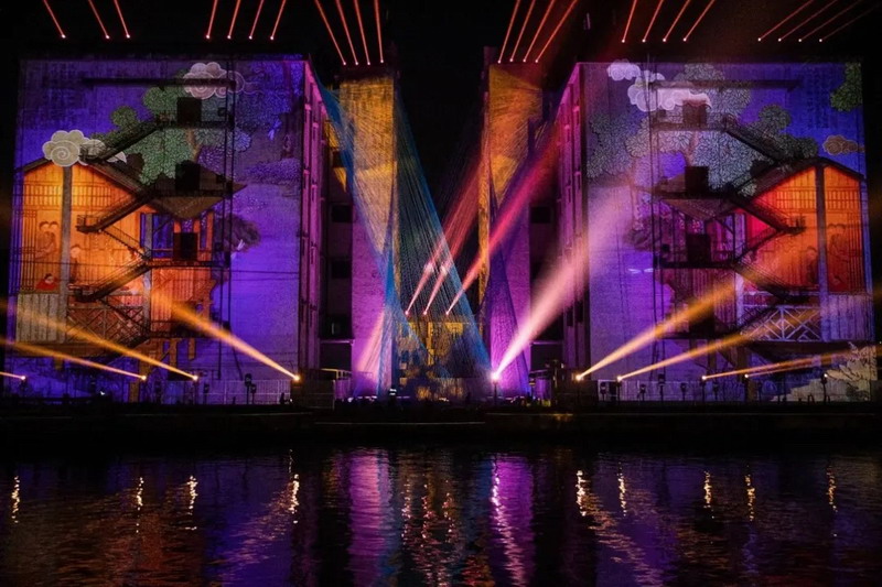 嘉絲聯的繭庫建筑上運用了3D光雕投影技術,打破常規的物理空間,通過工程投影機在建筑墻面上進行畫面投射,制造出有深度的視覺幻象和光影變化,通過聲、光、電高科技技術手段配合定制片源,達到敘事交融的影音互動效果,讓人不用佩戴3D眼鏡,也能感受到3D般的視覺特效。
